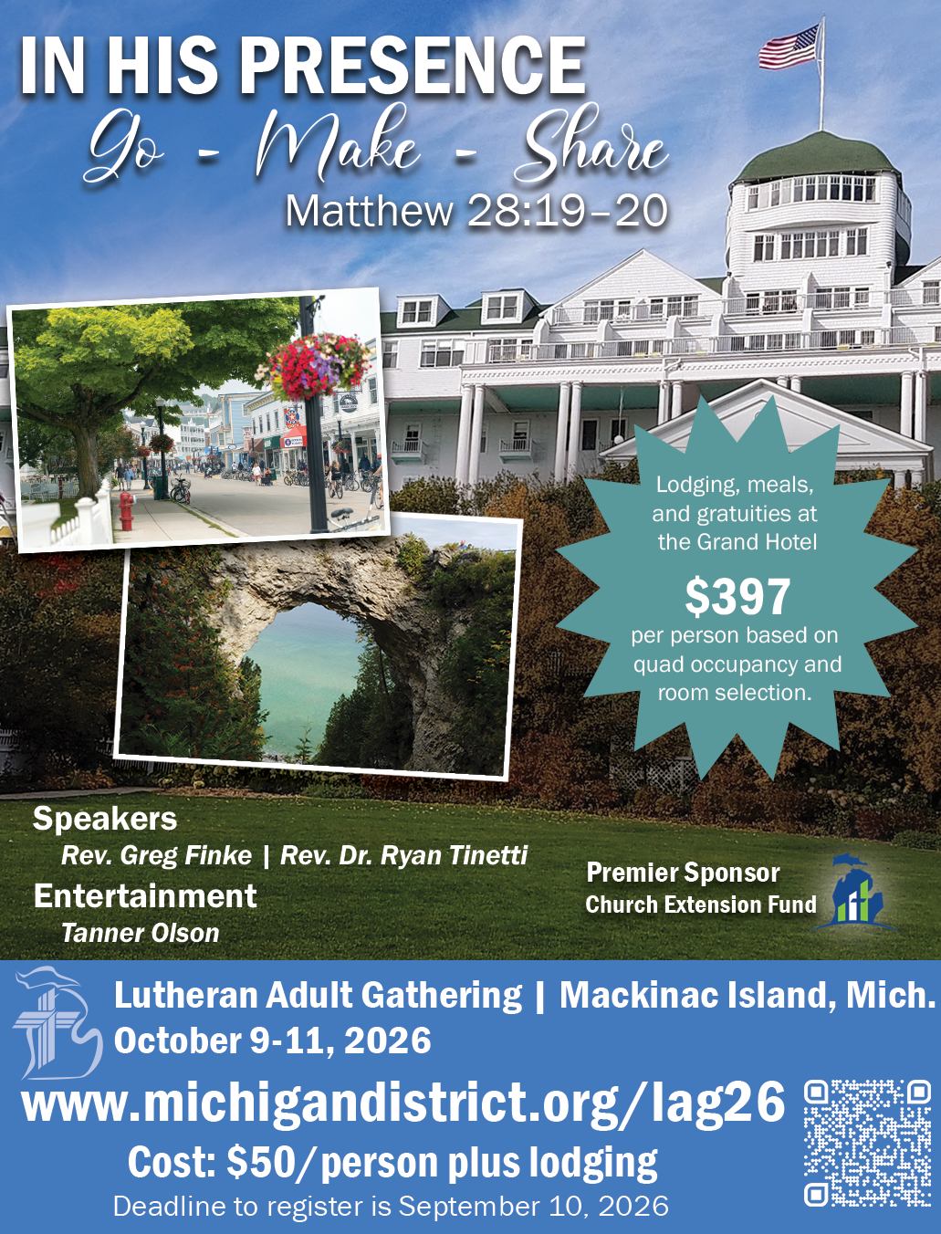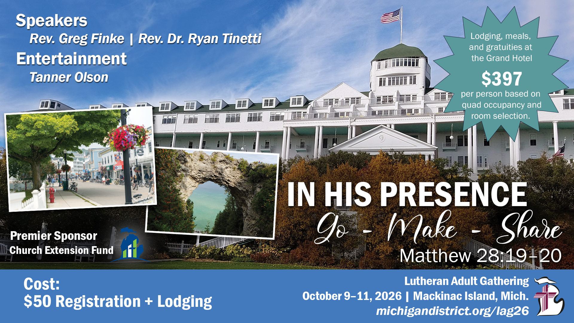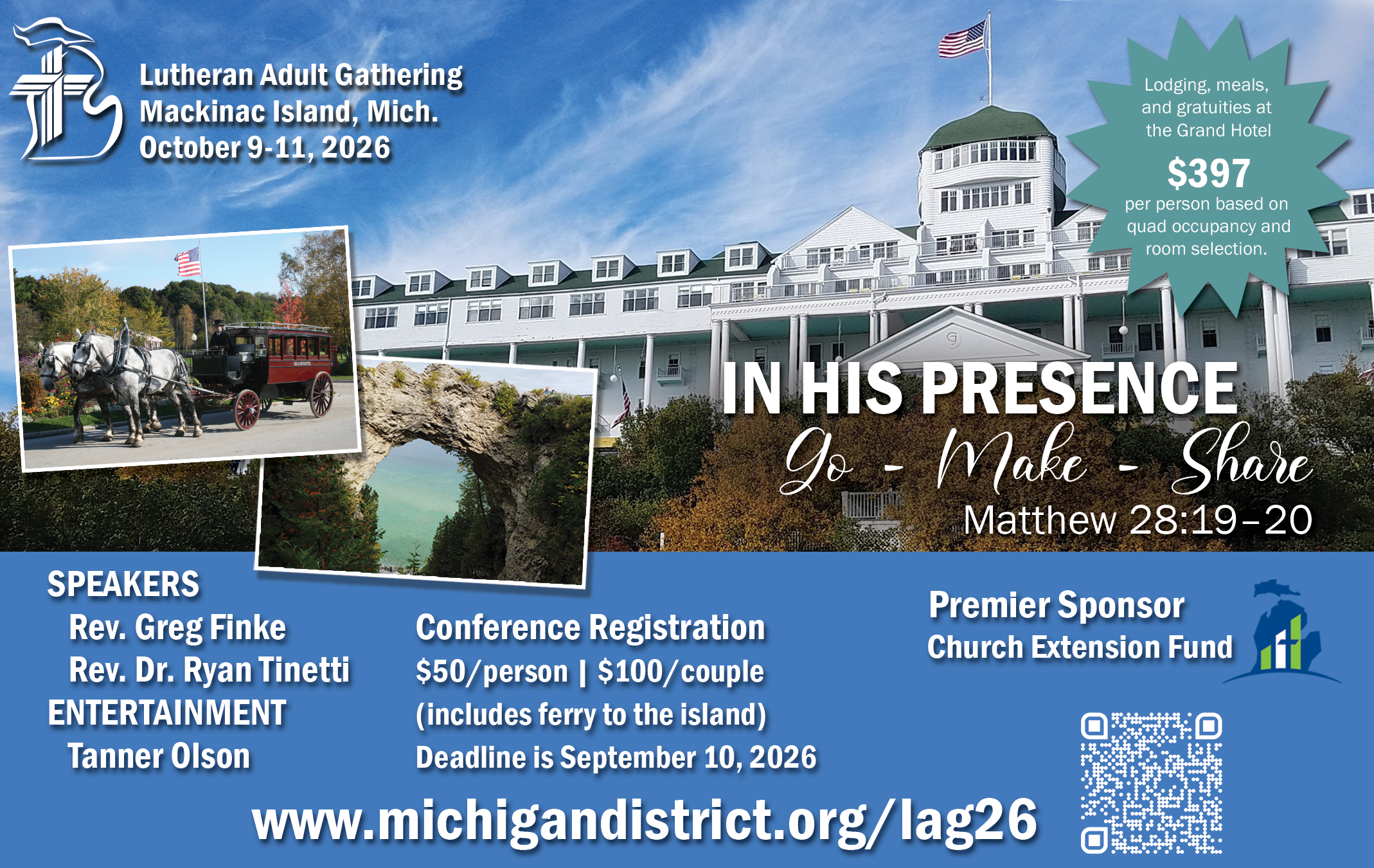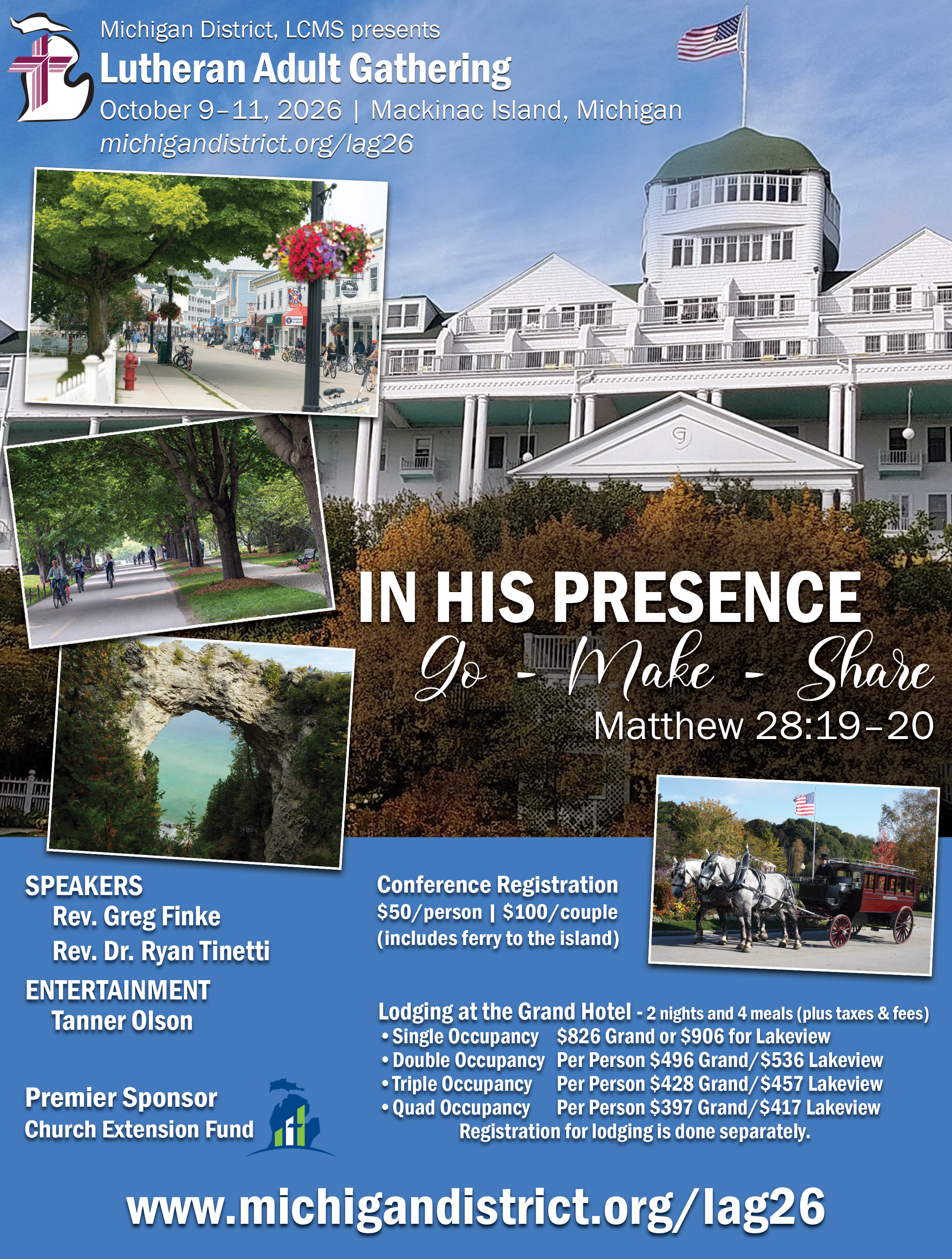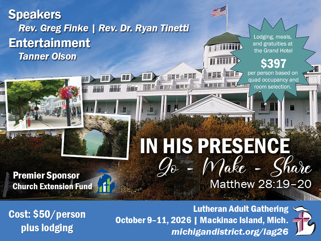 For decades, the Lutheran Adult Gathering has been bringing God’s people to the Grand Hotel on Mackinac Island for a mountaintop experience of spiritual renewal. In October 2026, we will gather under the theme “In His Presence: Go - Make - Share,” based on the Great Commission of Matthew 28:19–20. Speakers Greg Finke and Ryan Tinetti will equip us for sharing the Gospel in our context. As we gather “In His presence,” we will be renewed and refreshed, surrounded by the fellowship of believers, and equipped to give a joyful witness to the living hope we have in Jesus. Join us!